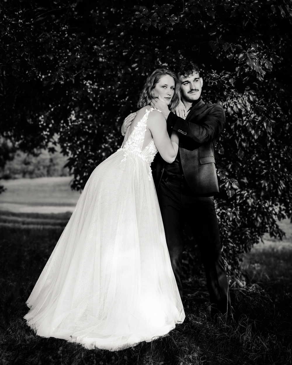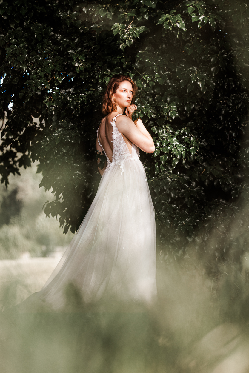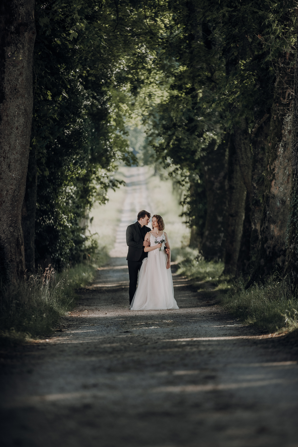 Der Weg durch die Baumallee wird zur Bühne für kontrastreiche Portraits voller Tiefe und Ausdruck. Zwischen Lichtstreifen, schattigen Pfaden und flüsternden Blättern fangen die Bilder zugleich Nähe, Weite und Bewegung in einem Gefühl des Zeitstillstands ein. Auf diesem gemeinsamen Lebensweg verbinden sich Selbstbestimmung und Hingabe. Jeder Blick und jede Geste erzählt das Versprechen zweier Menschen: „Eines werde ich in diesem Leben mit Sicherheit tun: dich lieben, mich nach dir sehnen und dich immer in meinem Herzen tragen.“